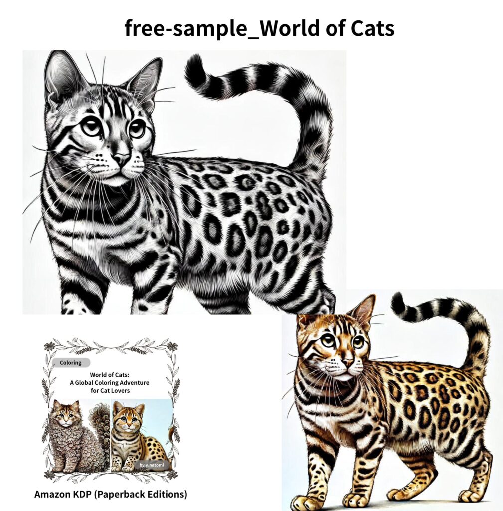 You can download one free sample coloring page featuring a Bengal cat.